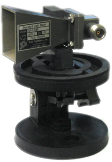 The Standard Gain Horn Antennas are designed specifically for utilization in emissions and immunity testing over the frequency range of 1 to 40 GHz. The SAS-586 standard gain horn antenna is linearly polarized and has medium gain, low VSWR, and a constant antenna factor. The Standard Gain Horn performance is very precise and predictable through design parameters. Comparisons of measured versus computed antenna factors and gain have been shown to be +/- .5 dB. Therefore, the antenna is considered to be a standard reference, similar to that of a resonant dipole below 1 GHz. The coax-to-waveguide adapter is the only power-limiting component on the antenna and can be removed if high fields are desired. Each Standard Gain Horn comes with a tripod mount that adapts to any tripod with ¼-20 male threads. Horizontal and vertical polarization is obtained by rotating the antenna on the tripod.